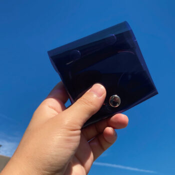 今回ご紹介するRYOTA MIYAGIのクリアウォレットは、1枚の透明PVC素材を折り曲げて作られた、縫い目のない小型の二つ折り財布です。サイズは縦横ともに約8.5cmで、クレジットカードとほぼ同じ大きさの極小設計となっています。重さはわずか39gと非常に軽量です。