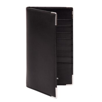 エッティンガーの「SILVER CORNERS COAT WALLET」は、薄さを追求した約18cm×約10cmの長財布です。銀貨や銀食器に使用され英国に馴染みの深いスターリングシルバーをコーナーパーツに採用した「SILVER CORNERSシリーズ」の一つで、ブラックカーフと上品に輝くシルバーの組み合わせが高級感を引き立てています。