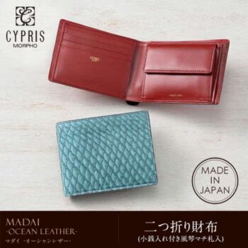 「【キプリス】二つ折り財布(小銭入れ付き風琴マチ札入)■MADAI -Ocean Leather- [4131]」は、ユニークな素材を使用した製品です。レッドとブルーの2色展開となっています。