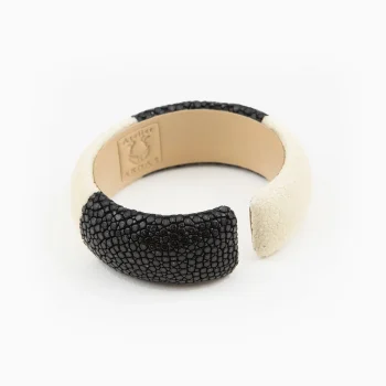 このバングルは、ノワール(黒)とスノー(白)のガルーシャを組み合わせた20mm幅の魅力的なアイテムです。モノクロームの色彩が宝石のような光沢を放ち、洗練されたモード感を高めています。中世ヨーロッパの技法を用い、シームレスな貼り合わせによる三次元的な立体の丸みが特徴です。しなやかに曲がるので装着時に広げても元に戻る安心感と、豪華な見た目を兼ね備えています。