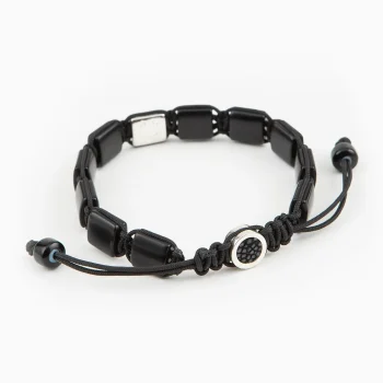 このビーズブレスレットは、ノワール(黒)のガルーシャをポイントに使用したエレガントなアイテムです。ブラックの天然石を四角いストーンビーズに加工し、同系色の航海用ナイロンコードで繋ぎ合わせることで、シックで洗練されたデザインに仕上げています。MACRAME(マクラメ)技法を駆使したデザイン性と、スターリングシルバー925のオリジナルアジャスターが、ブレスレット全体に高級感を添えています。