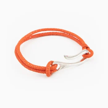 タンジェリン(オレンジ色)のガルーシャをダブルロープにしたブレスレットは、エネルギッシュで明るい雰囲気を持っています。ハンドメイドのスターリングシルバー925のフックに、コードを簡単に引っ掛けるだけで装着できるシンプルさが魅力です。ガルーシャの光沢と活力を与える色合いが、手首に華やかなアクセントを加えます。