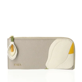 しなやかな花のカットワークが美しいデザインです。天然シュリンクレザーを使用しており、ナチュラルなシボ感が特徴です。このレザーは、汚れや傷が目立ちにくく、長く使用することができます。花のモチーフが施された引手は、おしゃれでありながらも実用的で、毎日のお買い物やお出かけを華やかに彩ります。