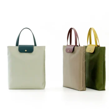 縦型のスリムなシルエットが特徴です。A4サイズのファイルやノートがすっきりと収まり、ビジネスシーンでも活躍します。内側にはファスナーポケットやオープンポケットが充実しており、細かなアイテムを整理整頓するのに便利です。また、マイボトルや折り畳み傘も収納できるため、サブバッグとしても利用できます。このハンドバッグは福井県産の高品質ナイロンを使用しており、軽量でありながら丈夫なつくりが魅力です。上品で落ち着いた艶感のあるナイロンにレザーを組み合わせ、カジュアルながらもエレガントな印象を与えます。