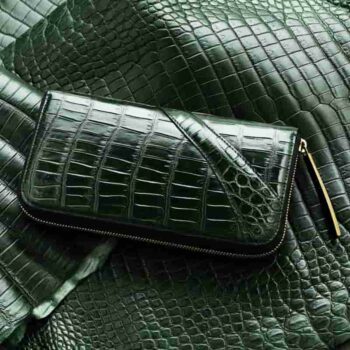 特に注目すべきは、経年変化が魅力的な2つのシリーズです。まず、「ティラノクロコダイル」シリーズは、同社が「藍染クロコダイル」を共に完成させたタンナーと一から作り上げた自信作だそうです。このシリーズは、使う人のライフスタイルによって世界に一つの表情に育っていくとのこと。丁寧に使えば上品で美しい緑に、激しく使えばより光沢感が出て、恐竜らしいワイルドで力強い風合いに変化していくそうです。