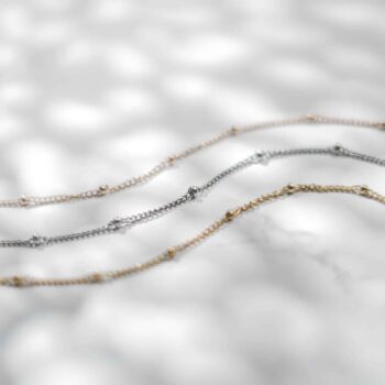 「Lauss タイニービーズのデザインチェーン ペアアンクレット サージカルステンレス(316L) つけっぱなしOK klb061 アレルギー対応」は、細めの喜平チェーンに小さなステンレスビーズを組み合わせた繊細なデザインが特徴です。軽量で着けやすく、シルバー、ピンクゴールド、イエローゴールドの3色のカラーバリエーションがあるそうです。