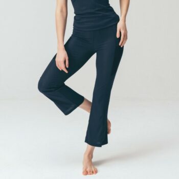 チュール素材のポケットがアクセントのリブフレアパンツ。スリムなシルエットでスタイリッシュに見せ、着心地も抜群です。デザインはDOUBLE STANDARD CLOTHINGが監修しており、ヨガだけでなくデイリー使いにもおすすめです。