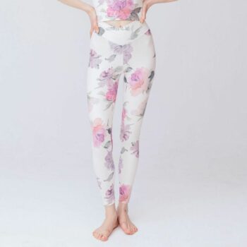ペールトーンの華やかな大花柄が特徴のリジーオリジナルプリントレギンス。クロスデザインがウエストを美しく見せ、柔らかく伸びの良いストレッチ素材でなめらかな着心地を提供します。