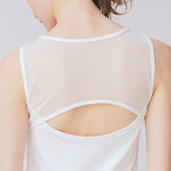 胸元のシャーリングと肩周りのチュールが女性らしい印象を与えるタンクトップ。シアー素材の透け感と吸水速乾素材で涼しく快適な着心地。素材は廃ペットボトル由来の再生プラスチックを使用したサステナブル素材です。デザインはDOUBLE STANDARD CLOTHINGが監修しています。