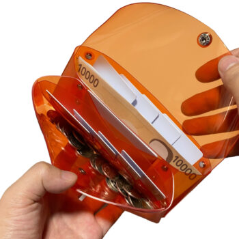 特徴的なのは、横幅約8.6cmとクレジットカードとほぼ同サイズでありながら、お札を折らずに収納できる点です。収納力も十分で、お札15枚、硬貨15枚、カード8枚程度を収納可能。透明素材で中身が見える遊び心があり、ファッションのアクセントとしても活用いただけます。