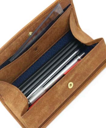 ボールペンが5~6本入るサイズで、ボックス型のため中が見やすい仕様になっています。スナップボタンで留めるタイプで出し入れが手軽であり、本体の形状が崩れにくく設計されているため、バッグの中でも収まりが良いのが特徴です。