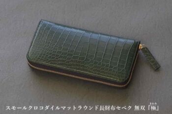 最後に、「スモールクロコダイルラウンド長財布セベク無双『極』」は、お客様の要望から生まれたというセベクグリーンカラーが特徴。スモールクロコダイル革を丸々一匹分使用したセンター一枚取りで、内面にもクロコダイルを使用する無双仕立て。職人の技が光る逸品です。