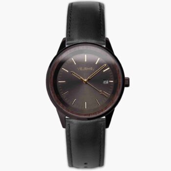 「A01 | black (automatic)」は、ヴェアホイが初めて発表した自動巻き式腕時計です。この製品の特徴は、天然くるみ材と316Lガンメタルを融合させた独特のデザインにあります。木製部品は強固なサファイアガラスの下に配置されており、スチール製の時計と同等の耐久性を実現しています。
